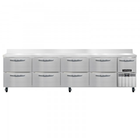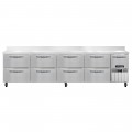 Refrigerated Base Worktop Unit, 118"W, 300 series stainless steel work top with 6"H backsplash, stainless steel front & end panels, galvanized steel rear & grill, aluminum interior, (8) drawers hold (2) 12 x 20 x 6 pans per drawer (supplied by others), (1) half height field rehingeable door, electronic control, off cycle defrost, R290 Hydrocarbon refrigerant, 1/4 HP, side-mounted refrigeration, cETLus, NSF