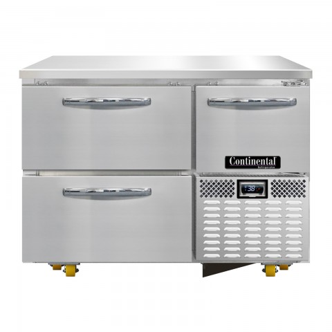 Undercounter Refrigerated Base, 43"W, stainless steel front & end panels, stainless steel top, aluminum interior, (2) drawers & (1) half height field rehingeable door, electronic control, off cycle defrost, (8) 1-3/8" diameter plate casters mounted on heavy-duty support plates (easily field installed), 1/4 hp, front breathing, side-mounted refrigeration, R290 hydrocarbon refrigerant, cETLus, NSF