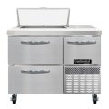 Refrigerated Base Shallow Depth Sandwich Unit, 43"W, 300 series stainless steel top with (6) 1/6 size x 4" deep pans, stainless steel front & sides, galvanized steel case back, aluminum interior, 10" deep nylon cutting board, (2) drawers hold (1) 12 x 20 x 6 pans per drawer (supplied by others), (1) half height field rehingeable door, electronic control, off cycle defrost, hot gas condensate evaporator, 1/4 HP, side-mounted refrigeration, R290 Hydrocarbon refrigerant, cETLus, NSF