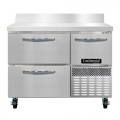Refrigerated Base Shallow Depth Worktop Unit, 43"W, 300 series stainless steel work top with 6"H backsplash, stainless steel front & end panels, galvanized steel rear & grill, aluminum interior, (2) drawers hold (1) 12 x 20 x 6 pans per drawer (supplied by others), (1) half height field rehingeable door, electronic control, off cycle defrost, 1/4 HP, side-mounted refrigeration, R290 hydrocarbon refrigerant, cETLus, NSF