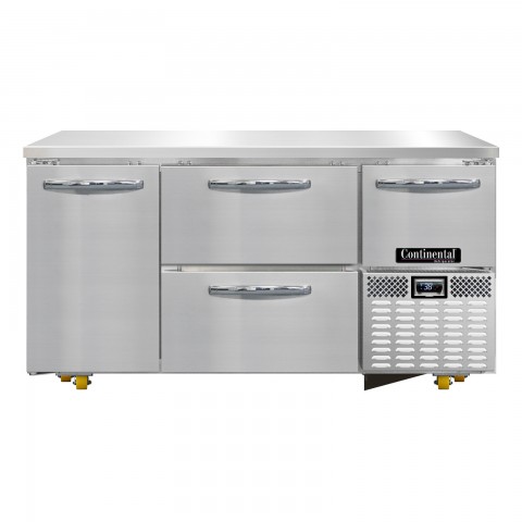 Undercounter Refrigerated Base, 60"W, stainless steel front & end panels, stainless steel top, aluminum interior, (2) drawers hold (2) 12 x 20 x 6 pans per drawer (supplied by others), (2) narrow drawers hold (1) 12 x 20 x 6 pans per drawer (supplied by others) & (1) half height field rehingeable door, electronic control, off cycle defrost, (8) 1-3/8" diameter plate casters mounted on heavy-duty support plates (easily field installed), 1/4 HP, front breathing, side-mounted refrigeration, R290 hydrocarbon refrigerant, cETLus, NSF