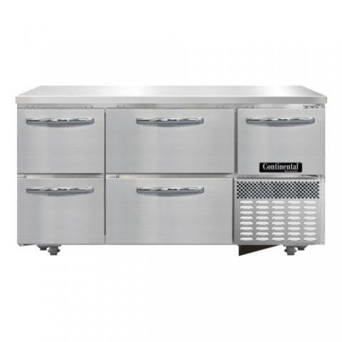 Undercounter Shallow Depth Refrigerated Base, 60"W, stainless steel front & end panels, stainless steel top, aluminum interior, (2) drawers hold (1) 12 x 20 x 6 pans per drawer (supplied by others), (2) narrow drawers hold (4) 6 x 6 2/3 x 6 pan per drawer (supplied by others) & (1) half height field rehingeable door, electronic control, off cycle defrost, (8) 1-3/8" diameter plate casters mounted on heavy-duty support plates (easily field installed), 1/4 HP, front breathing, side-mounted refrigeration, R290 hydrocarbon refrigerant, cETLus, NSF