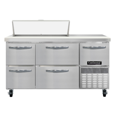 Refrigerated Base Shallow Depth Sandwich Unit, 60"W, 300 series stainless steel top with (10) 1/6 size x 4" deep pans, stainless steel front & sides, galvanized steel case back, aluminum interior, 10" deep nylon cutting board, (2) drawers hold (1) 12 x 20 x 6 pans per drawer (supplied by others), (2) narrow drawers hold (4) 6 x 6 2/3 x 6 pan per drawer (supplied by others), & (1) half height field rehingeable door,electronic control, off cycle defrost, hot gas condensate evaporator, 1/3 HP, side-mounted refrigeration, R290 Hydrocarbon refrigerant, cETLus, NSF