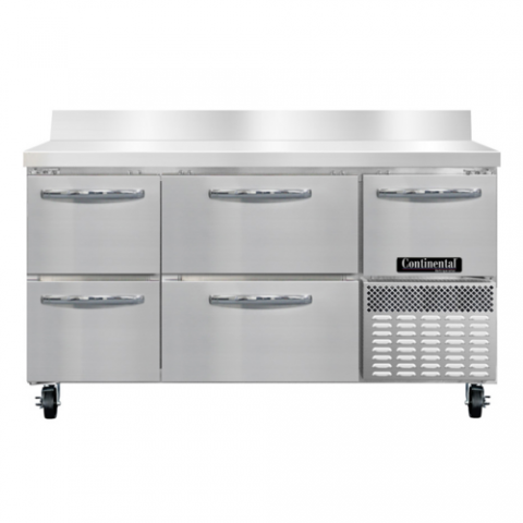 Refrigerated Base Shallow Depth Worktop Unit, 60"W, 300 series stainless steel work top with 5-1/2"H backsplash, stainless steel front & end panels, galvanized steel rear & grill, aluminum interior, (2) drawers hold (1) 12 x 20 x 6 pans per drawer (supplied by others), (2) narrow drawers hold (4) 6 x 6 2/3 x 6 pan per drawer (supplied by others) & (1) half height field rehingeable door, electronic control, off cycle defrost, 1/4 HP, side-mounted refrigeration, R290 hydrocarbon refrigerant, cETLus, CE, NSF