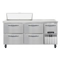 Refrigerated Base Sandwich Unit, 68"W, 300 series stainless steel top with (10) 1/6 size x 4" deep pans, stainless steel front & sides, galvanized steel case back, aluminum interior, 12" deep nylon cutting board, (4) drawers - top drawers hold (1) 12" x 20" + (3) 1/6 pans each & Bottom drawers holds (2) 12" x 20" pans each, (1) half height field rehingeable door, electronic control, off cycle defrost, hot gas condensate evaporator, 1/3 HP, side-mounted refrigeration, R290 Hydrocarbon refrigerant, cETLus, NSF