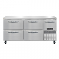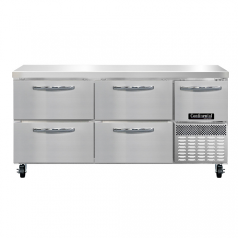 Refrigerated Base Shallow Depth Worktop Unit, 68"W, 300 series stainless steel flat work top, stainless steel front & end panels, galvanized steel rear & grill, aluminum interior, (4) drawers hold (1) 12 x 20 x 6 pans per drawer (supplied by others), (1) half height field rehingeable door, electronic control, off cycle defrost, 1/4 HP, side-mounted refrigeration, R290 hydrocarbon refrigerant, cETLus, NSF