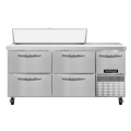 Refrigerated Base Shallow Depth Sandwich Unit, 68"W, 300 series stainless steel top with (12) 1/6 size x 4" deep pans, stainless steel front & sides, galvanized steel case back, aluminum interior, 10" deep nylon cutting board, (4) drawers - hold (1) 12 x 20 x 6 pan per drawer (supplied by others), (1) half height field rehingeable door, electronic control, off cycle defrost, hot gas condensate evaporator, 1/3 HP, side-mounted refrigeration, R290 Hydrocarbon refrigerant, cETLus, NSF