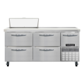 Refrigerated Base Shallow Depth Sandwich Unit, 68"W, 300 series stainless steel top with (8) 1/6 size x 4" deep pans, stainless steel front & sides, galvanized steel case back, aluminum interior, 10" deep nylon cutting board, (4) drawers - hold (1) 12 x 20 x 6 pan per drawer (supplied by others), (1) half height field rehingeable door, electronic control, off cycle defrost, hot gas condensate evaporator, 1/3 HP, side-mounted refrigeration, R290 Hydrocarbon refrigerant, cETLus, NSF