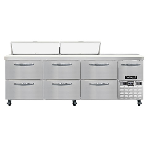 Refrigerated Base Sandwich Unit, 93"W, 300 series stainless steel top with (18) 1/6 size x 4" deep pans, stainless steel front & sides, galvanized steel case back, aluminum interior, 12" deep nylon cutting board, (6) drawers - top drawers hold (1) 12" x 20" + (3) 1/6 pans each & Bottom drawers holds (2) 12" x 20" pans each, (1) half height field rehingeable door, electronic control, off cycle defrost, hot gas condensate evaporator, 1/3 HP, side-mounted refrigeration, R290 Hydrocarbon refrigerant, cETLus, NSF