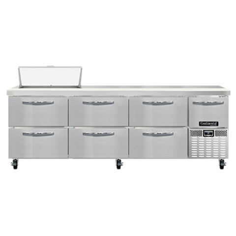 Refrigerated Base Sandwich Unit, 93"W, 300 series stainless steel top with (8) 1/6 size x 4" deep pans, stainless steel front & sides, galvanized steel case back, aluminum interior, 12" deep nylon cutting board, (6) drawers - top drawers hold (1) 12" x 20" + (3) 1/6 pans each & Bottom drawers holds (2) 12" x 20" pans each, (1) half height field rehingeable door, electronic control, off cycle defrost, hot gas condensate evaporator, 1/3 HP, side-mounted refrigeration, R290 Hydrocarbon refrigerant, cETLus, NSF