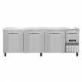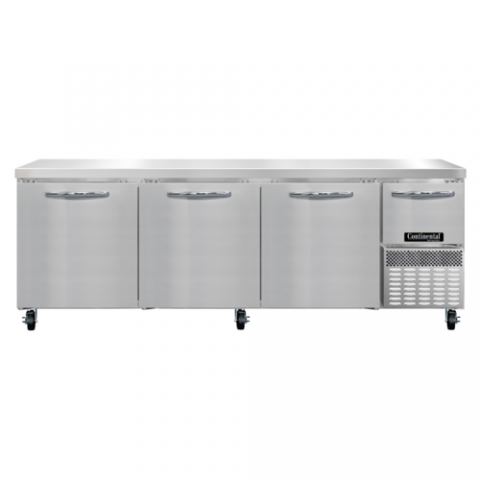 Refrigerated Base Shallow Depth Worktop Unit, 93"W, 300 series stainless steel flat work top, stainless steel front & end panels, galvanized steel rear & grill, aluminum interior, (3) full & (1) half height field rehingeable doors, electronic control, off cycle defrost, 1/4 HP, side-mounted refrigeration, R290 hydrocarbon refrigerant, cETLus, NSF, ENERGY STAR®