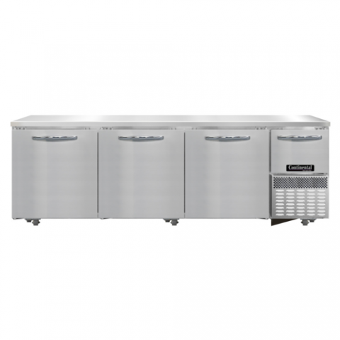 Undercounter Shallow Depth Refrigerated Base, 93"W, stainless steel front & end panels, stainless steel top, aluminum interior, (3) full & (1) half height field rehingeable doors, electronic control, off cycle defrost, (12) 1-3/8" diameter plate casters mounted on heavy-duty support plates (easily field installed), 1/4 HP, front breathing, side-mounted refrigeration, R290 hydrocarbon refrigerant, cETLus, NSF