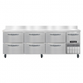 Refrigerated Base Shallow Depth Worktop Unit, 93"W, 300 series stainless steel work top with 6"H backsplash, stainless steel front & end panels, galvanized steel rear & grill, aluminum interior, (6) drawers hold (1) 12 x 20 x 6 pans per drawer (supplied by others), (1) half height field rehingeable door, electronic control, off cycle defrost, 1/4 HP, side-mounted refrigeration, R290 hydrocarbon refrigerant, cETLus, NSF