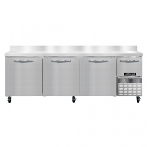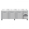 Refrigerated Base Shallow Depth Worktop Unit, 93"W, 300 series stainless steel work top with 6"H backsplash, stainless steel front & end panels, galvanized steel rear & grill, aluminum interior, (3) full & (1) half height field rehingeable doors, electronic control, off cycle defrost, 1/4 HP, side-mounted refrigeration, R290 hydrocarbon refrigerant, cETLus, NSF, ENERGY STAR®