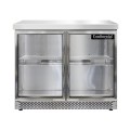 Work Top Display Refrigerator, Front Breather, 36"W, 10.3 cu ft capacity, two-section, stainless steel flat top, (2) glass doors, LED interior lighting, stainless steel front & end panels, aluminum interior, 3-3/4" casters, rear mounted self-contained refrigeration, R290 Hydrocarbon refrigerant, 1/4 HP, cETLus, NSF