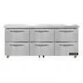 Undercounter Refrigerator, 72"W, 20.6 cu ft capacity, three-section, (6) drawers, accommodates (1) 12 x 18 x 6 or (1) 1/2 x 6 & (1) 1/3 x 6 pans per drawer (supplied by others), stainless steel front, top & end panels, aluminum interior, 1-3/8" diameter plate casters, front breathing, rear-mounted self-contained refrigeration, R290 Hydrocarbon refrigerant, 1/5 HP, cETLus