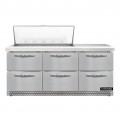 Mighty Top Sandwich Unit, Front Breather, 72"W, 20.6 cu ft capacity, three-section, (18) 1/6 size x 4" deep pans with 8" cutting board, (6) drawers, accommodates (1) 12 x 18 x 6 pan per drawer or (1) 1/2 x 6 & (1) 1/3 x 6 pans per drawer (supplied by others), stainless steel top, front & end panels, aluminum back & interior, 3-3/4" casters, rear mounted self-contained refrigeration, automatic hot gas condensate evaporator, R290 hydrocarbon refrigerant, 1/3 HP, cETLus, NSF