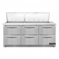 Mighty Top Sandwich Unit, Front Breather, 72"W, 20.6 cu ft capacity, three-section, (27) 1/6 size x 4" deep pans with 8" cutting board, (6) drawers, accommodates (1) 12 x 18 x 6 pan per drawer or (1) 1/2 x 6 & (1) 1/3 x 6 pans per drawer (supplied by others), stainless steel top, front & end panels, aluminum back & interior, 3-3/4" casters, rear mounted self-contained refrigeration, automatic hot gas condensate evaporator, R290 hydrocarbon refrigerant, 1/3/ HP, cETLus, NSF