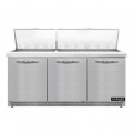 Mighty Top Sandwich Unit, Front Breather, 72"W, 20.6 cu ft capacity, three-section, (30) 1/6 size x 4" deep pans with 8" cutting board, (3) field rehingeable doors, stainless steel top, front & end panels, aluminum back & interior, 3-3/4" casters, rear mounted self-contained refrigeration, automatic hot gas condensate evaporator, R290 hydrocarbon refrigerant, 1/3 HP, cETLus, NSF