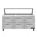 Mighty Top Sandwich Unit with Hinged Glass Lid, 72"W, 20.6 cu ft capacity, three-section, (30) 1/6 size x 4" deep pans with 8" cutting board, (6) drawers, accommodates (1) 12 x 18 x 6 pan per drawer or (1) 1/2 x 6 & (1) 1/3 x 6 pans per drawer (supplied by others), stainless steel top, front & end panels, aluminum back & interior, rear mounted self-contained refrigeration, automatic hot gas condensate evaporator, R290 hydrocarbon refrigerant, 1/3 HP, cETLus, NSF