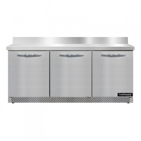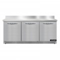 Work Top Refrigerator, Front Breather, 72"W, 20.6 cu ft capacity, three-section, stainless steel top with 5-1/2"H backsplash, (3) field rehingeable doors, stainless steel front & end panels, aluminum interior, 3-3/4" casters, rear mounted self-contained refrigeration, R290 Hydrocarbon refrigerant, 1/5 HP, cETLus, NSF, ENERGY STAR®