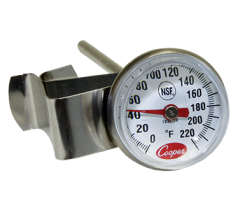 Espresso/Cafe Thermometer, 5" (12.3cm) shaft length, .150" (.38cm) shaft diameter, 1" (2.54cm) dial diameter, ±2°F accuracy, with vessel clip, temperature range 0 to 220°F, NSF (carded) (36 master carton) (Cooper)