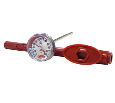 Pocket Test Thermometer, dial type with 5" stem, 1" diameter dial, .140" shaft diameter, temperature range 0 to 220°F, ±2°F temperature accuracy, includes adjustment tool and pocket clip, red protective sheath with antimicrobial additive, bi-metal, NSF (carded, pack of 2) (36 master carton) (Cooper)