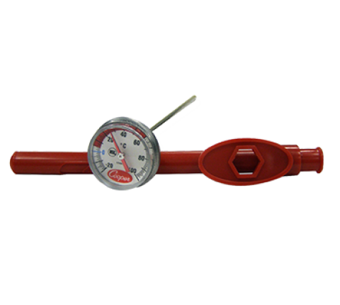 Pocket Test Thermometer, dial type with 5" stem, 1" diameter dial, .140" shaft diameter, temperature range -20° to 100°C, ±1°C temperature accuracy, includes adjustment tool and pocket clip, red protective sheath with antimicrobial additive, bi-metal, NSF (carded) (36 master carton) (Cooper)