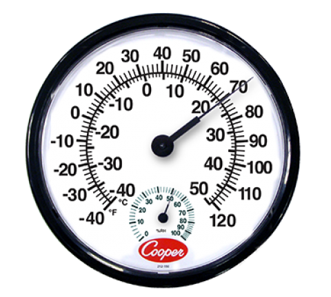 Indoor/Outdoor Wall Thermometer, 12" dia. (30.5cm) dial, temperature range -40 to 120°F (-40 to 50°C), ±3°For 30°F to 90°F and ±5°F all other, horizontal numbers, 0% to 100% relative humidity (10 master carton) (Cooper)