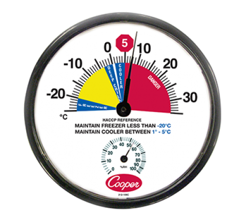 Freezer/Cooler Thermometer, 12" (30.5cm) dia. dial, temperature range -25° to 35°C, features HACCP reference color zone, 0% to 100% relative humidity (10 master carton) (Cooper)