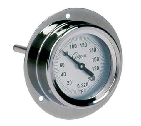 Thermometer, 3-1/2" (8.8cm) diameter back flange with 4" (10.16cm) stem length, 2" (5.08cm) diameter dial, .250" shaft diameter, temperature range 0° to 220°F (carded) (Cooper)