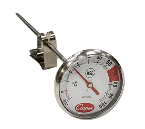 Espresso Thermometer, 1-3/4" (4.5cm) dia. dial with 7" (17.8cm) stem length, vessel clip, glass lens, temperature range 10 to 120°C, ±2°F temperature accuracy, NSF (36 master carton) (Cooper)