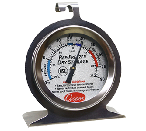 Refrigerator/Freezer/Dry Storage Thermometer, colored 2" (5cm) dia. dial zoned with specific applications and HACCP guidelines, temperature range -20 to 80°F (-29 to 27°C), ±2°F (±1°C) temperature accuracy, hang or stand, stainless steel, NSF (carded) (36 master carton) (Cooper)