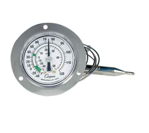 Thermometer, 2" panel type, 2" (5.08cm) front flange, -40° to 120°/F-40° to 50°C temperature range, ±2°F @ 40°F/±4°F @ 10°F/ ±5°F @ 110°F temperature accuracy, 48" (121.9cm) capillary length, NSF (36 master carton) (Cooper)