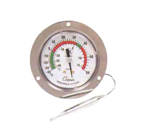 Thermometer, 2-1/2" panel type, front flange (6.35cm), -40 to 60°F/-40° to 15°C temperature range, ±2°F from 10° to 40°F/±3° below 10 or above 40°F temperature accuracy, 48" (121.9cm) capillary length, NSF (36 master carton) (Cooper)