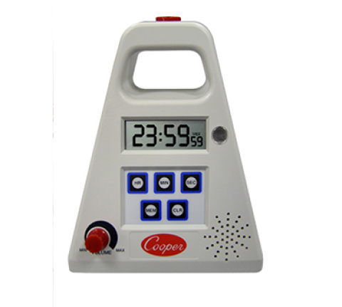 Timer, with Memory & Alarm, digital, 24-hour, counts in one second increments, non-skid rubber feet or wall mountable, volume controlled alarm, oversized LCD display, splash-proof keypad, red light flashes with alarm, 7" x 6" x 4" (17.8 x 15.2 x 10.2cm) 4 "C" batteries, 1.15 lbs. (521g) (6 master carton) (Cooper)