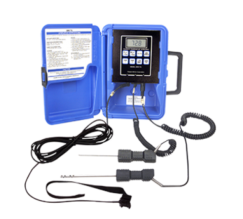 SRH77A Temperature Tester, digital, temperature range -40° to 300°F / -4° to 150°C, backlight display, sealed keypad, battery eliminator jack, 3-Zone, min/max memory, auto-shut off after 15 minutes of non-use or continuous ON mode, temperature differential between zones 1 & 2, %RH and wet bulb, Constant Scan feature records the min/max temperature from three probes, includes: Model 1075 General Purpose Puncture Probe, Model 4011 Pipe Strap Probe, and Model 5028 Humidity Probe, 9v battery, CE, RoHS, WEEE (Cooper)