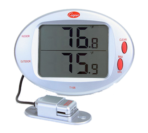 Indoor/Outdoor Min/Max Thermometer, temperature range (unit) 32° to 122°F/0° to 50°C, (remote) -58° to 158°F/-50° to 70°C, ±2°F temperature accuracy, 1.5v AAA battery (Cooper)