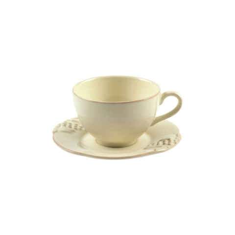 Tea Cup And Saucer, 4 1/4"W x 2 3/4"D x 2 3/4"H, 8 1/2 fl oz, oven safe, microwave safe, dishwasher safe, freezer safe, fine stoneware, madeira harvest, vanilla crème, (minimum = case quantity) (6 per case) (SETS UNAVAILABLE - Must order individual components: MC121-CRM - MP171-CRM)