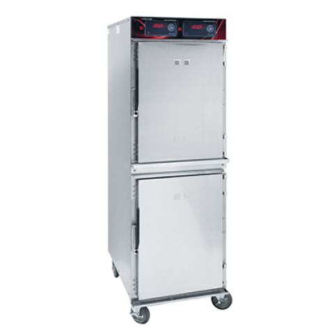 Heated Cabinet, Mobile, two compartment, radiant, insulated, top-mount heater assembly, (16) 18" x 26" or (32) 12" x 20" pan capacity, adjustable pan slides on 1-1/2" centers, (2) independent deluxe solid state electronic controls, LED digital displays, field reversible dutch doors, magnetic anti-microbial latches, stainless steel construction, (4) 5" swivel casters (2) with brakes, CSA-Sanitation, cCSAus