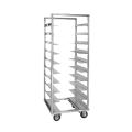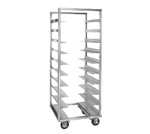 Mobile Tray Rack, single compartment, full height, open sides, with (10) angle slides for oval trays, slides on 6-1/8" centers, welded extruded aluminum frame, end loading, (4) heavy duty 5" swivel casters (2) braked, NSF