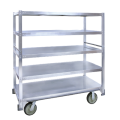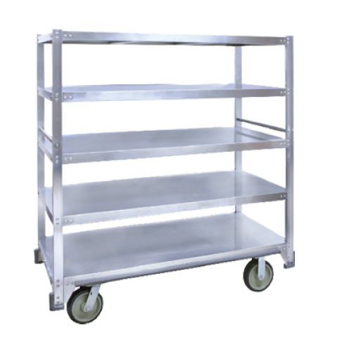 Queen Mary Cart, all riveted framework of structural aluminum extrusions, 5 shelves on 11" centers, side mounted push handles, bumpers, (4) 8" poly swivel casters (2) braked, NSF