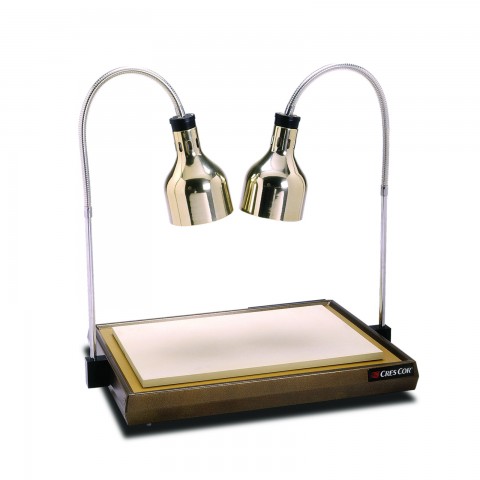 Carving Station, countertop, (2) adjustable arm, infra red lamps mounted to temperature controlled black powder coated base, recessed base catches drippings, rubber compound cutting board, polished nickel hood, NSF