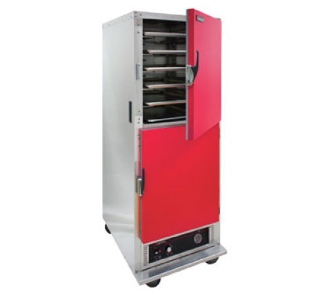 Cabinet, Mobile Heated, one compartment, insulated, bottom-mount heater assembly, field reversible red dutch doors, recessed push/pull handles, (11) sets of chrome plated wire universal angle slides on 4-1/2" centers, adjustable 1-1/2" centers, analog thermometer, anti-microbial latches, aluminum construction, (4) 5" swivel casters (2) braked, CSA-Sanitation, cCSAus