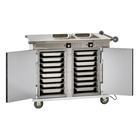 Heated Mobile Serving Cart, insulated, (2) heated food wells on top, (16) tray slides in cabinet, (2) compartments: (1) heated & (1) non-heated, adjustable heat, (2) solid doors, (1) push handle, 5" casters (2 locking), 1" fiberglass insulation in walls, doors & base, stainless steel construction, 120v/60/1-ph, 1500 watts (total), cCSAus, CSA Sanitation