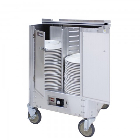 Dish Dolly, Heated, 240 plate capacity, non-adjustable, enclosed type with hinged doors, removable hinged top, front & rear doors, with fixed dish dividers for 9-7/8" - 11" plates, (4) heavy duty 5" swivel casters (2) braked, aluminum construction, cCSAus, CSA