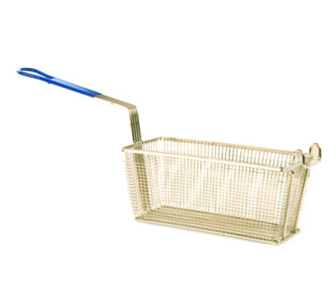 Fryer Basket, 13-1/4" x 5-5/8" x 5-11/16", front hook, heavy gauge wire, reinforced with extra heavy frame, stay cool plastic coated grip, nickel plated