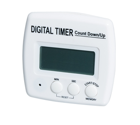 Digital Timer, 2-3/4" x 2-3/4", counts up to down from 99 minutes, 59 seconds, LCD display, easy to read numbers, built-in stand and magnet on back, operates on (1) AAA battery (not included), white