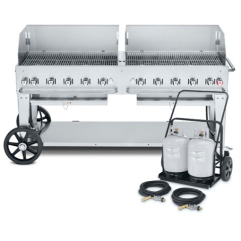 Club Series Mobile Cart Grill with Tank Cart, LP gas, 70" x 21" grill area, 10 burners, 304 stainless steel construction, stainless steel grill, (2) 36" wind guardsradiants, lighter tube (pilot), water pan, undershelf, legs with (2) 14" wheels & (2) total lock casters, 15,000 BTU per burner NSF, SA, ETL