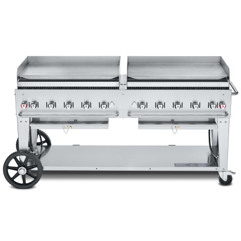 Outdoor Griddle, mobile, Natural gas, 10 burners, 81"L x 28"W, stainless steel construction, undershelf & legs, (2) 14" wheels & (2) total lock casters, 159,000 BTU, cETLus, ETL-Sanitation